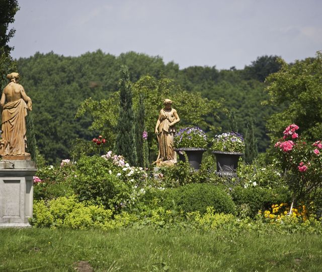 Das neugotische Schloss ist von einem prächtigen englischen Garten, angefüllt mit üppigen Stauden, Rosen und vielen weiteren Pflanzen, umgeben. Besichtigungen sind während der Festivals möglich.