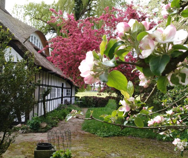 Der erste Blick gebührt dem reetgedeckten Haupthaus des Fachwerkensembles von 1863.
