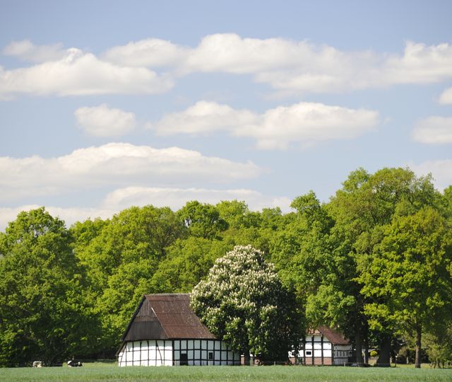 Inmitten grüner Wiesen und Felder liegt Gut Arenshorst, ein Rittersitz aus dem 18. Jahrhundert.