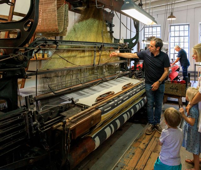 An historischen laufenden Maschinen sehen Sie die Verarbeitung der Wolle vom Schaf bis zum Tuch.